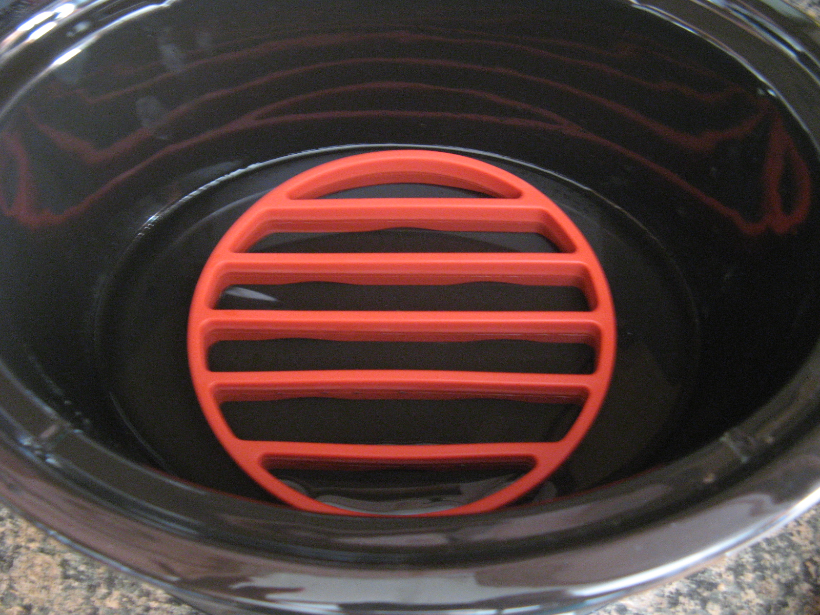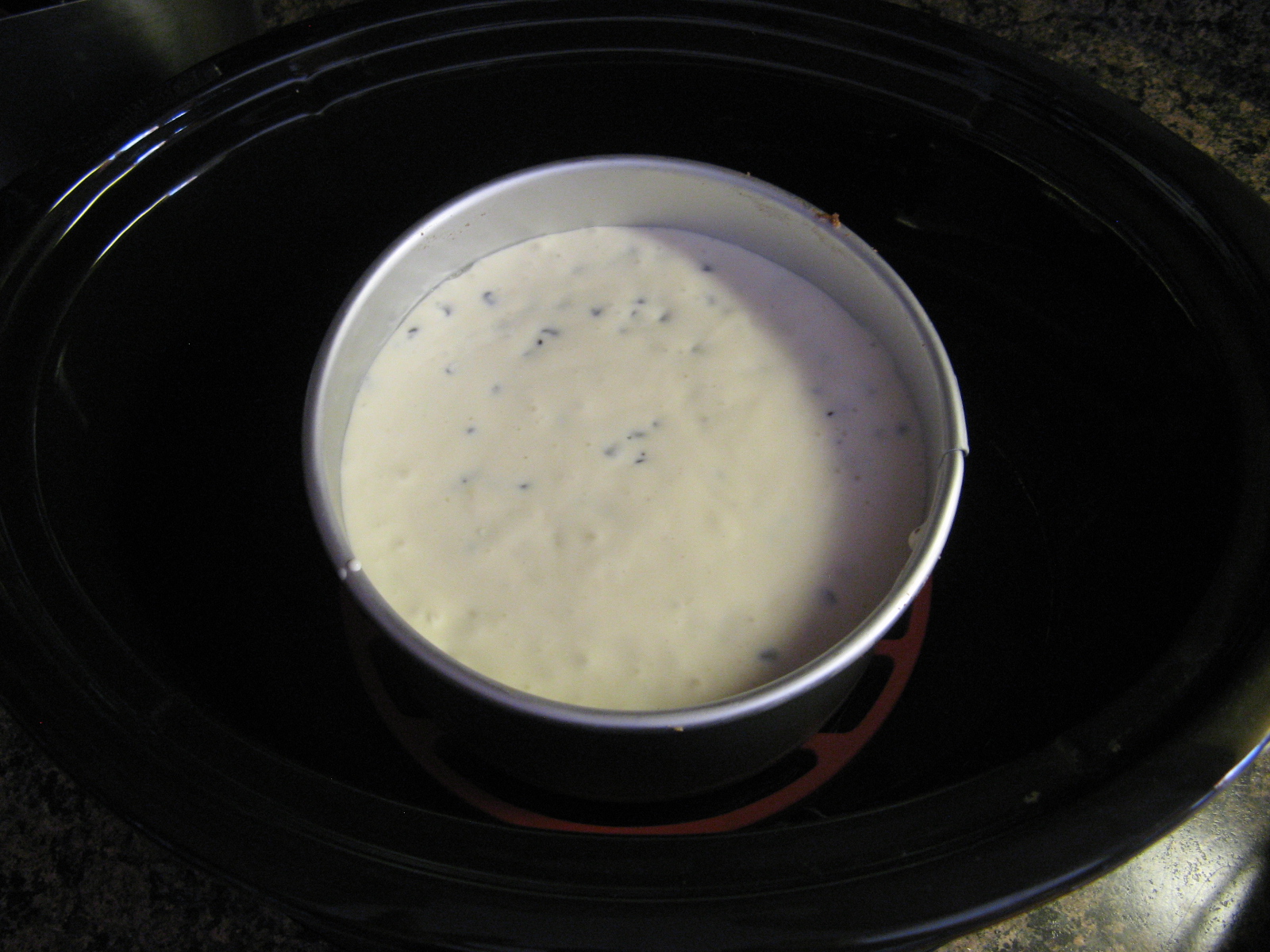 Spray a 6-inch springform pan with cooking spray. Place a rack inside the insert of your slow cooker and fill with a 1/2 inch of water (about 2 cups for a 6qt. slow cooker).