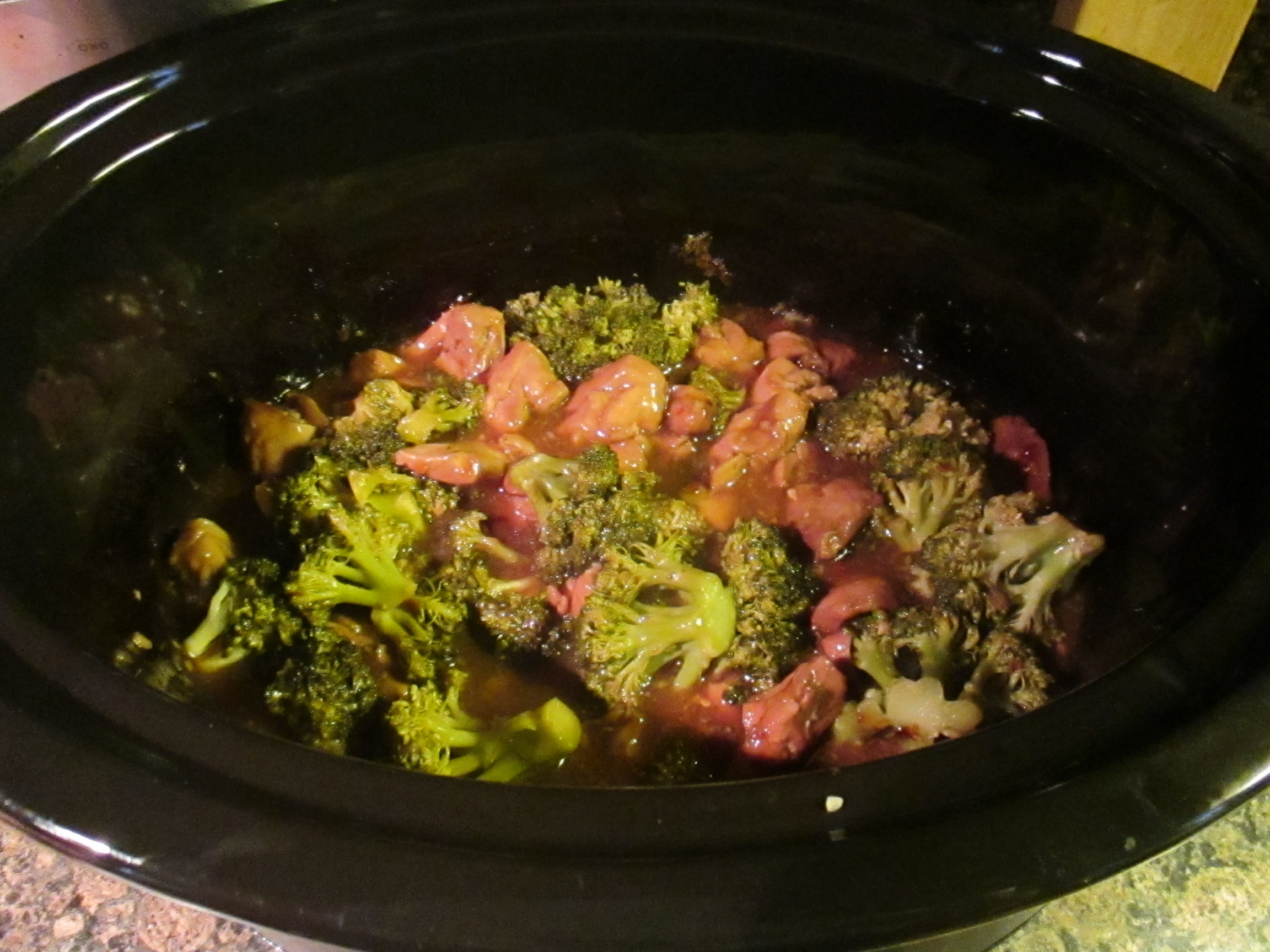 After 2 hours, I added in a cornstarch-water mixture to thicken the sauce and some fresh broccoli florets and continued cooking everything for an additional hour on the high setting.