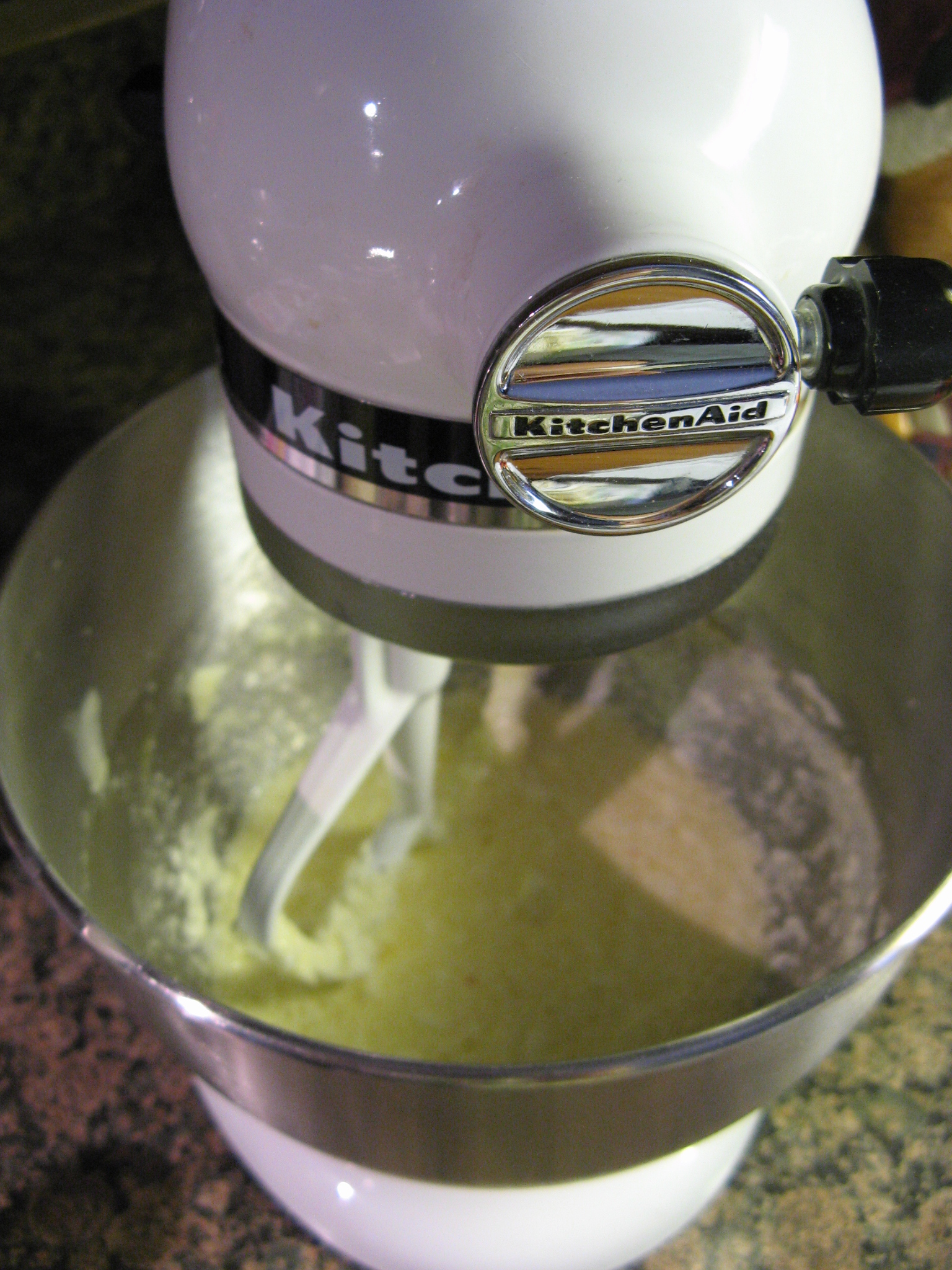 Next, in the bowl of my stand mixer I creamed room temperature butter until it was light and fluffy. Following that I gradually added in a cup of sugar. And finally I added in 1 egg and 2 egg whites.