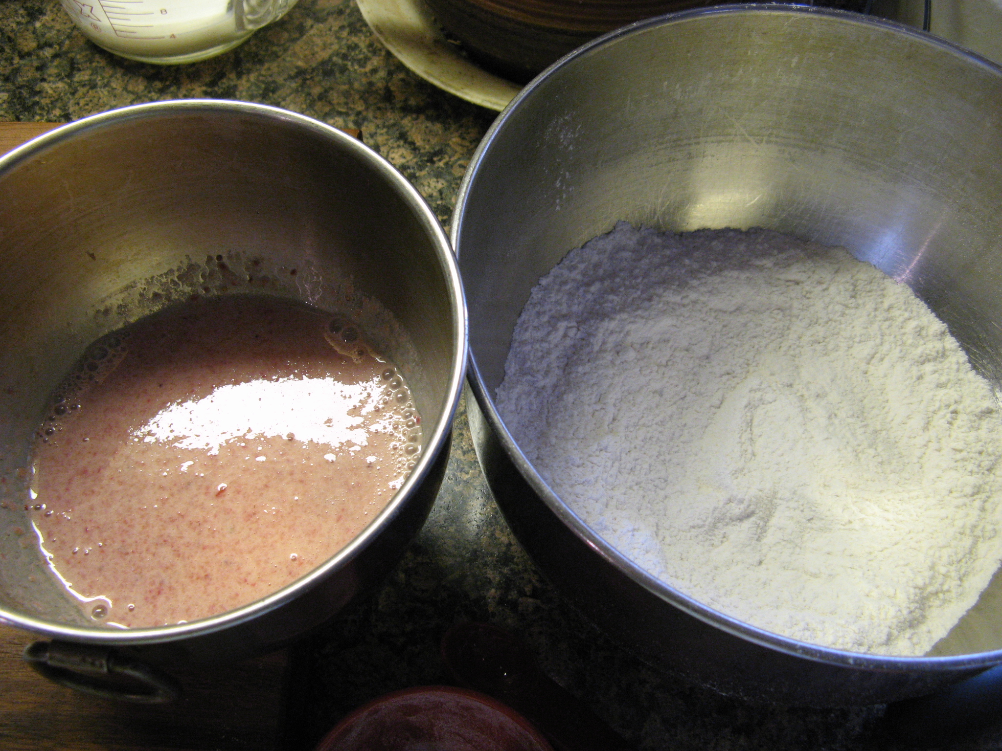 I then combined the pureed strawberries with whole milk and vanilla extract. In another bowl I whisked together flour, baking powder and salt.