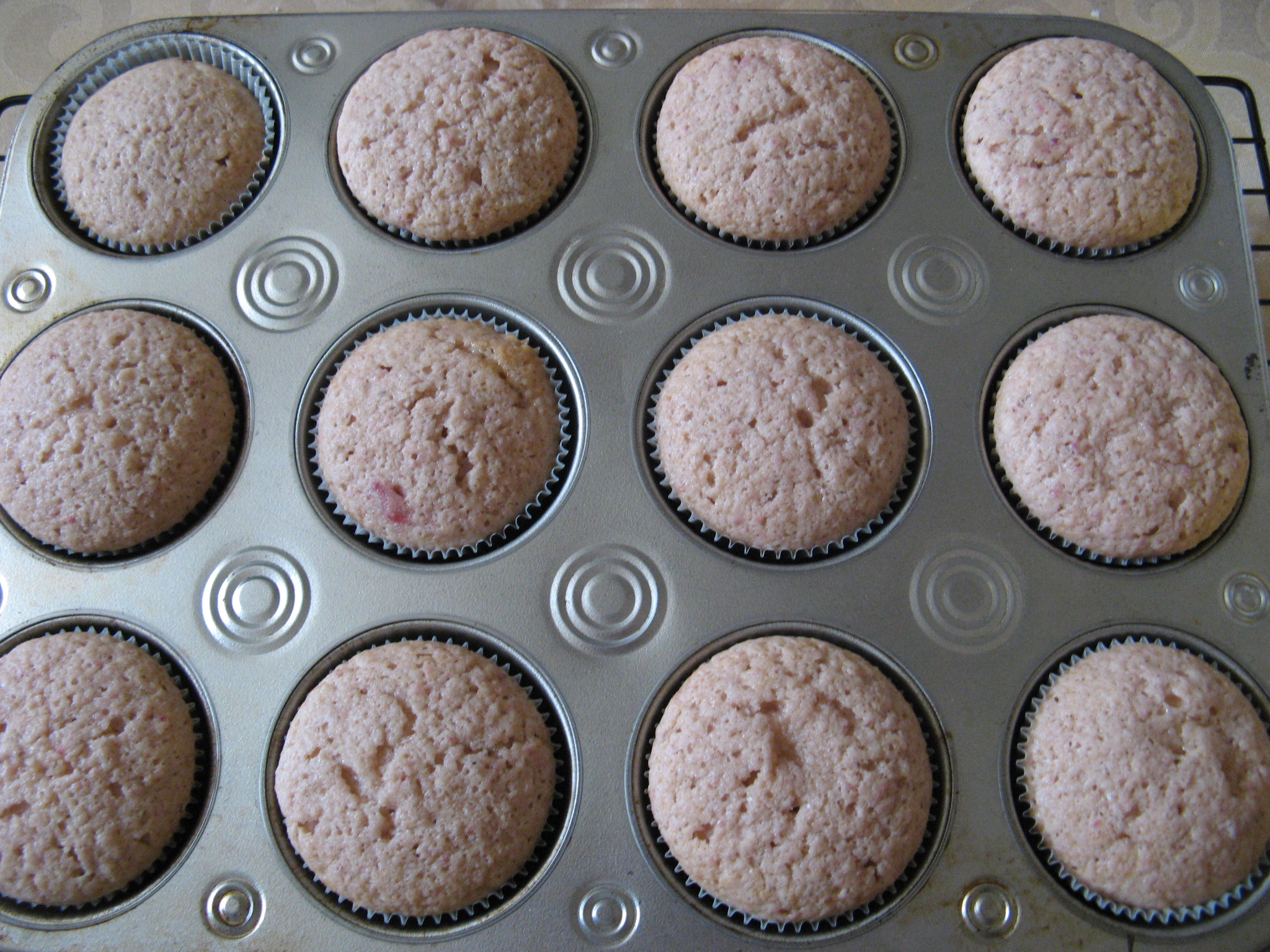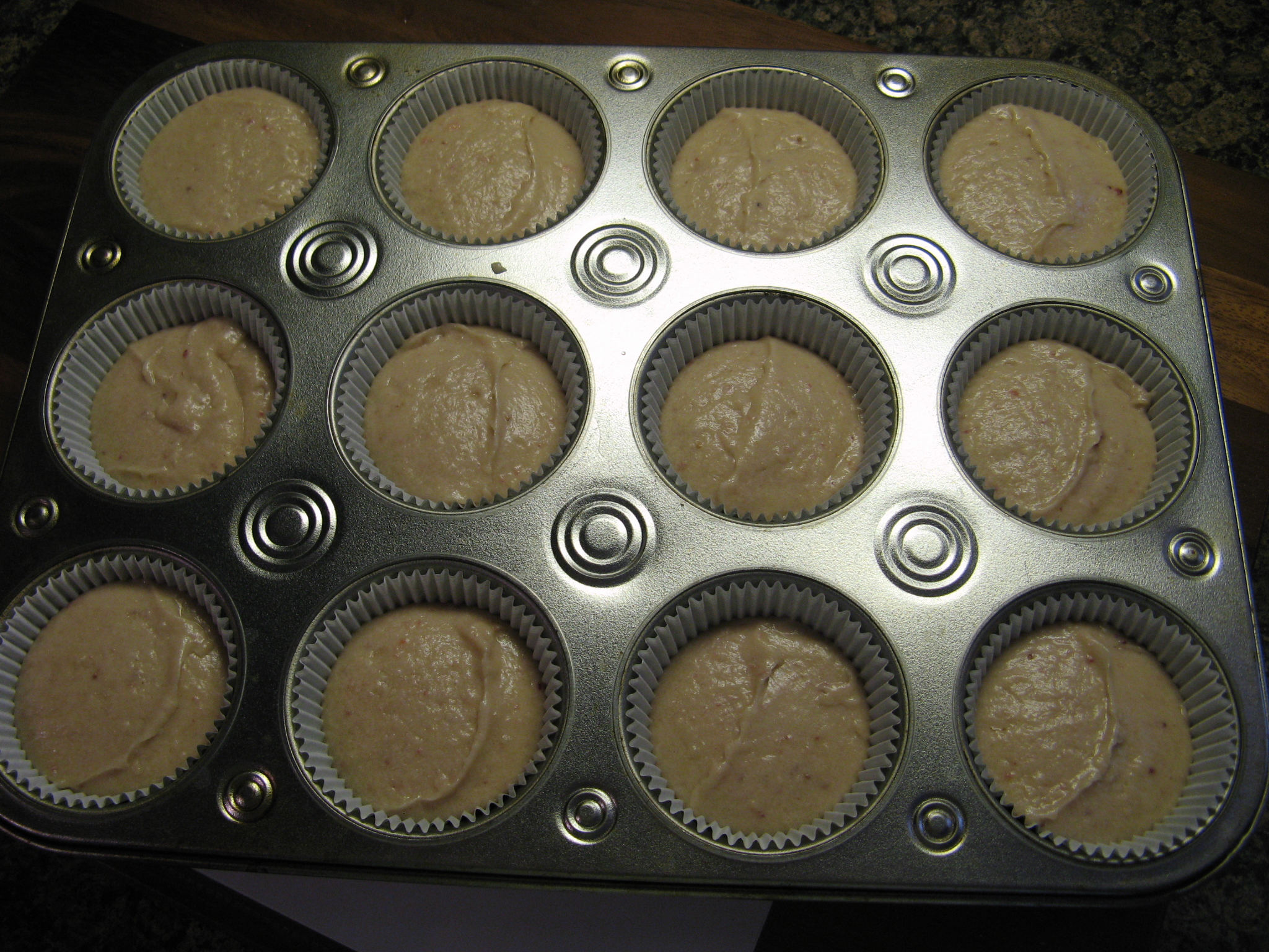 After dividing the batter evenly among a paper lined muffin tin I placed it in a 350 F preheated oven.