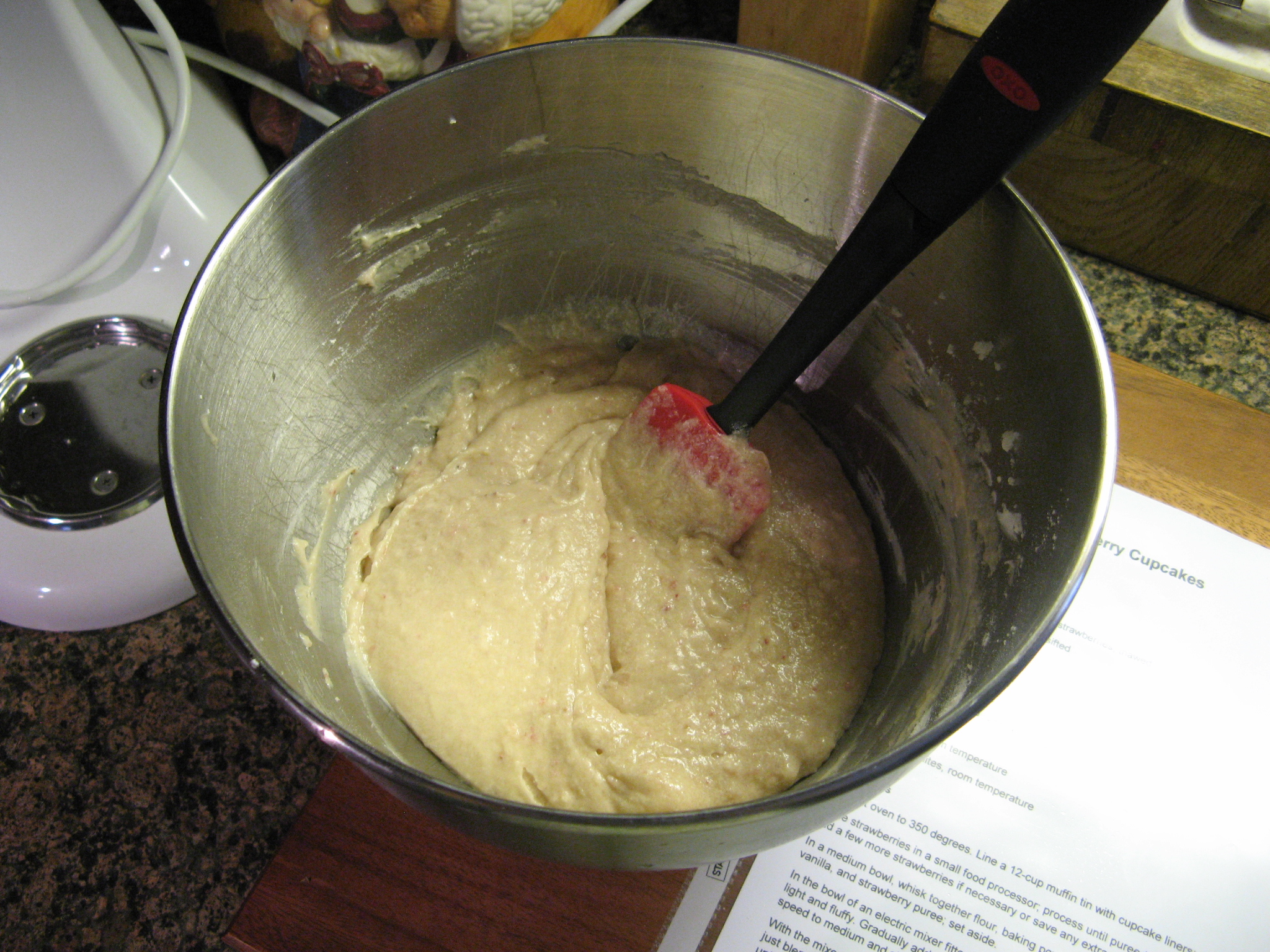With the mixer on low I added in half of the flour mixture, then all of the strawberry mixture and then the other half of the flour mixture. I mixed it until it was just combined and then finished mixing it by hand using a rubber spatula so I wouldn’t accidentally overbeat the batter.