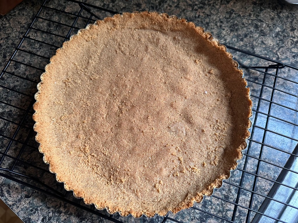 Once the filling was ready, I placed the crust on a baking sheet and strained it through a fine mesh sieve directly into the cooled crust.