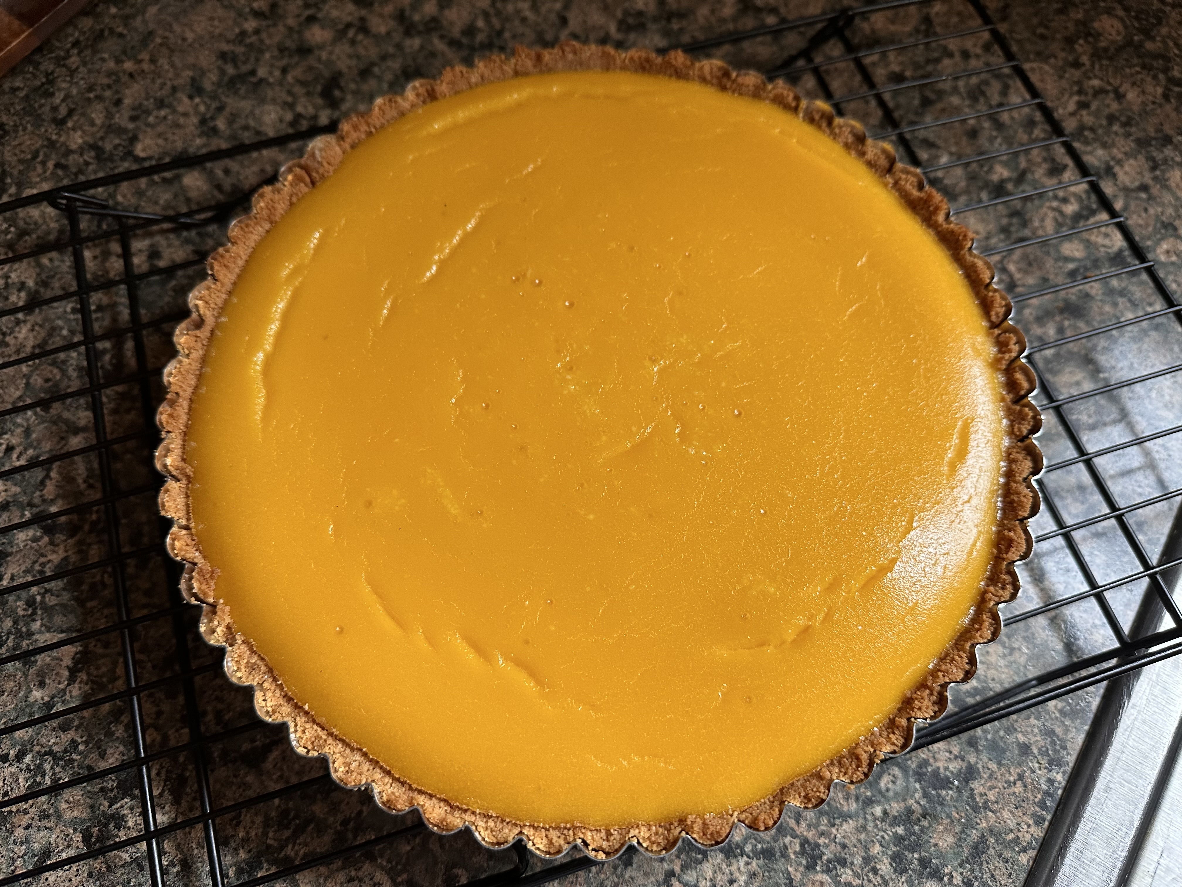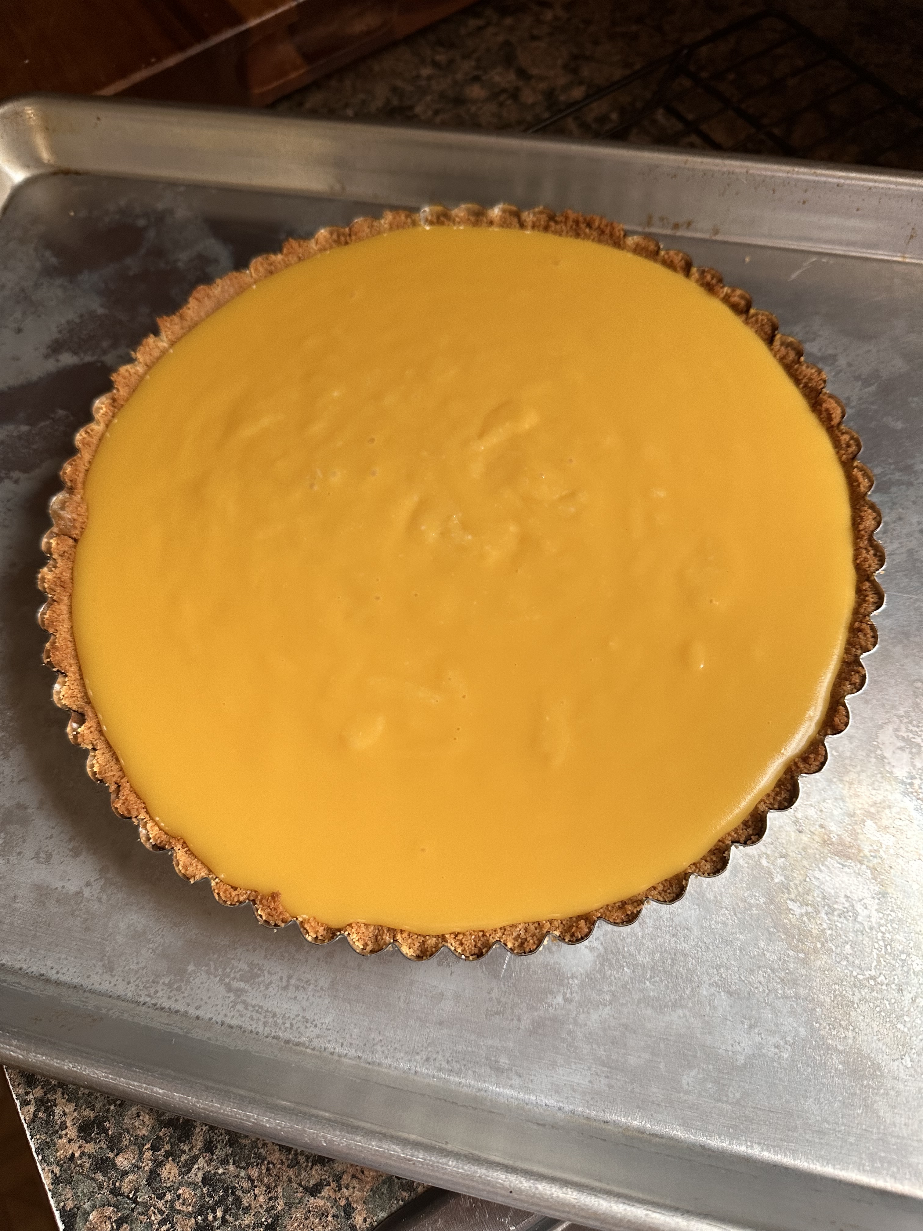 Place the cooled crust on a baking sheet. Strain the mango filling through a fine mesh sieve directly into the crust. Bake until the filling is set but the center is still a bit jiggly, 25 to 30 minutes. Let cool to room temperature before refrigerating for 4 to 6 hours.