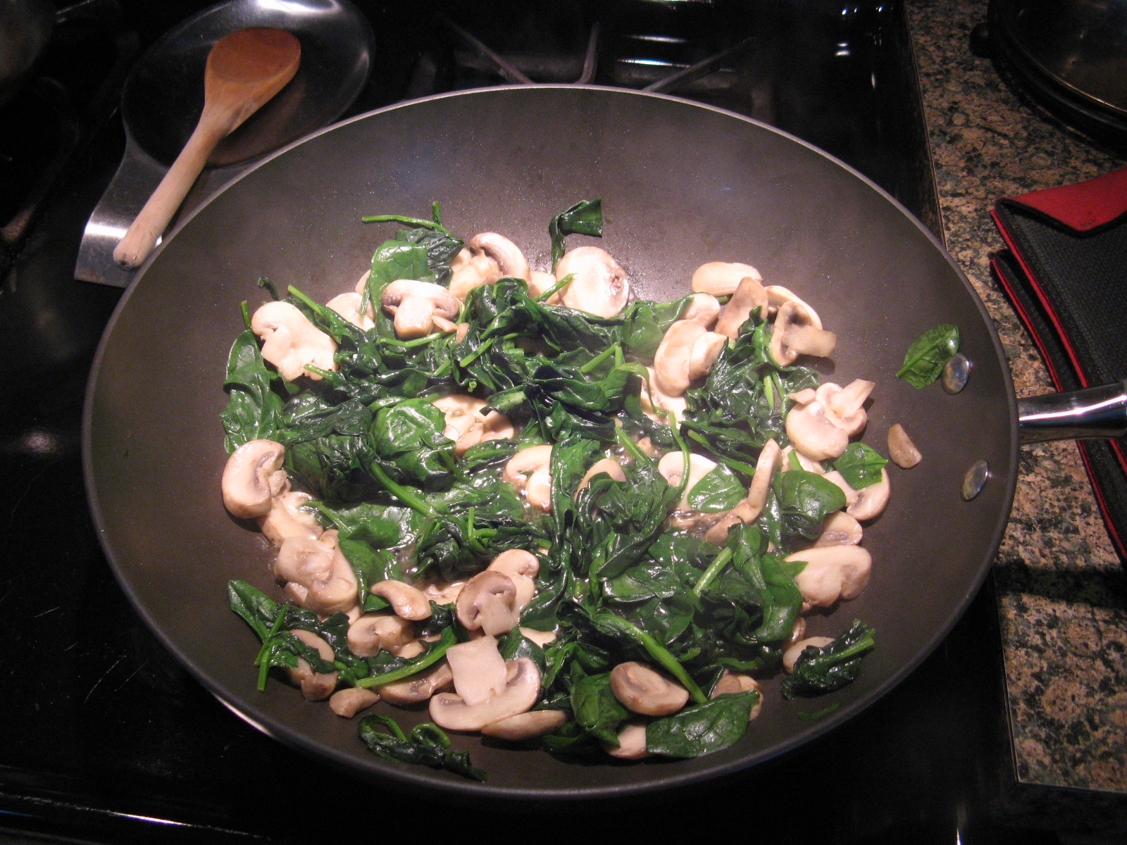 To begin, over medium-high heat I sautéed mushrooms in olive oil for a few minutes and then added in baby spinach and continued sautéing until the mushrooms were tender and the spinach had wilted.