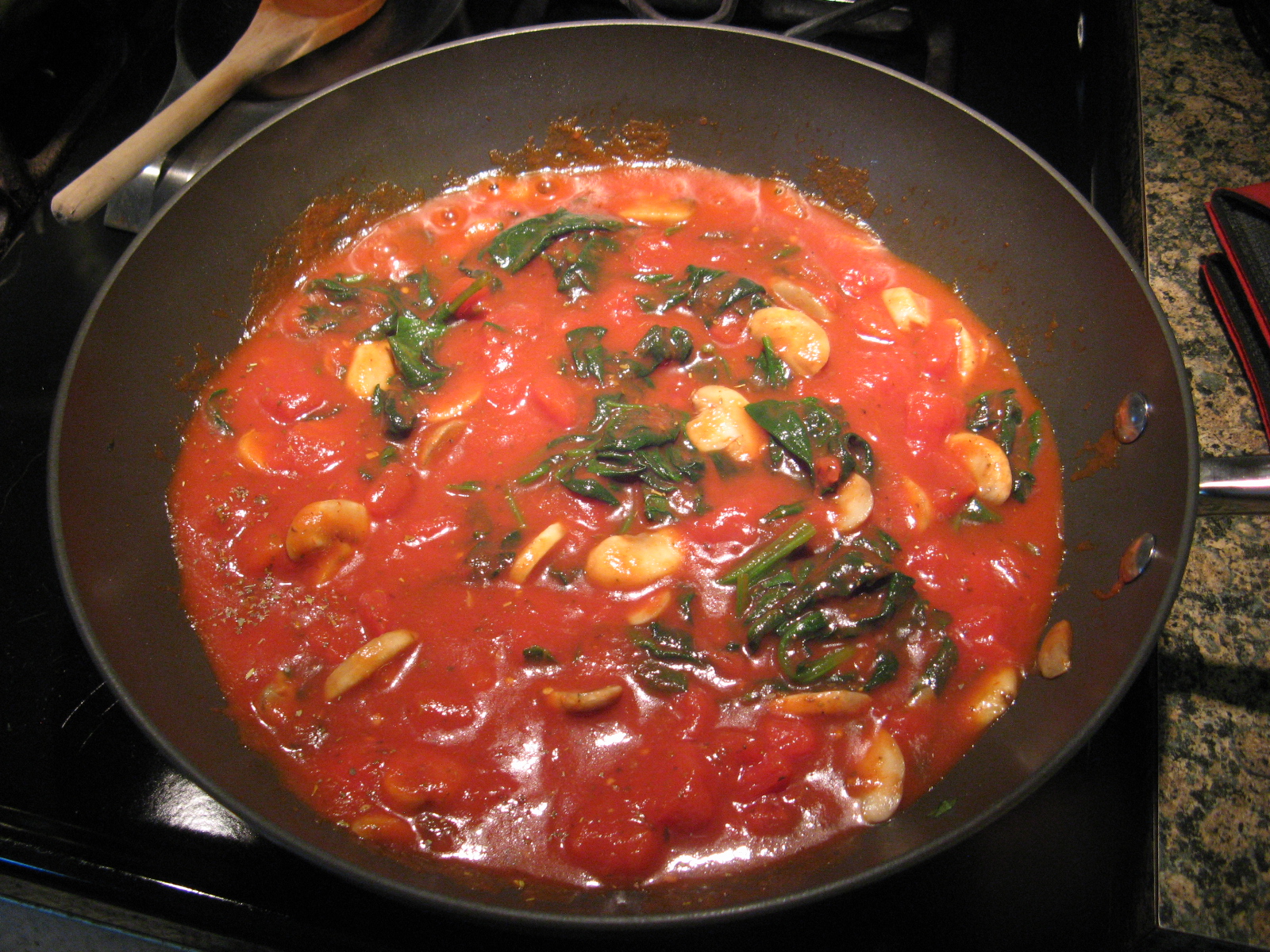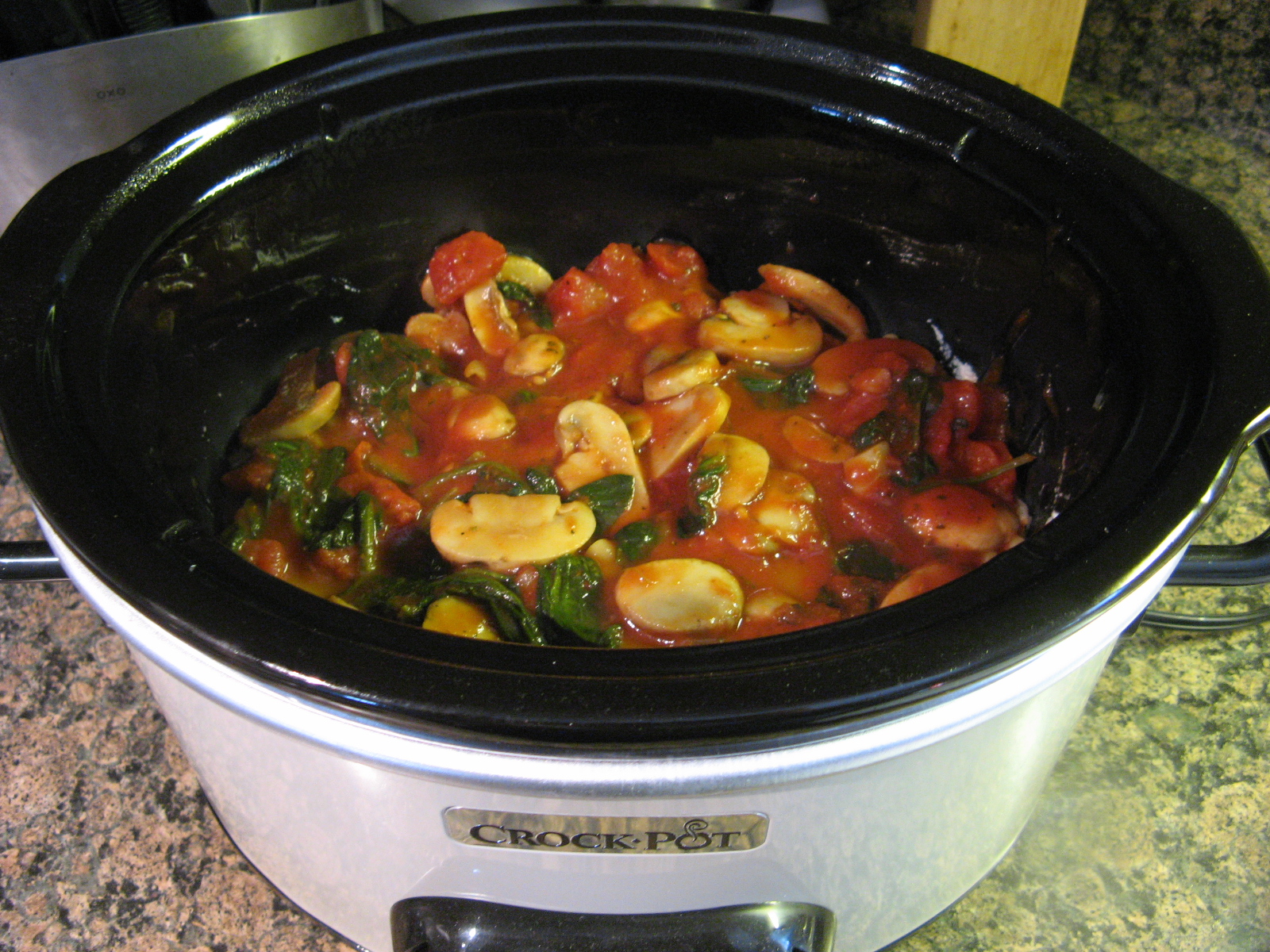 Spray the inside of a 4-quart slow cooker with the cooking spray. Heat oil in a large skillet over medium-high heat. Add the mushrooms and cook for 3 minutes, stirring occasionally. Add in the spinach cook a few more minutes, until the mushrooms are tender and the spinach has wilted, stirring occasionally. Stir in the undrained tomatoes, tomato sauce, Italian seasoning and salt. Bring to a boil then reduce the heat and simmer for 3 minutes.