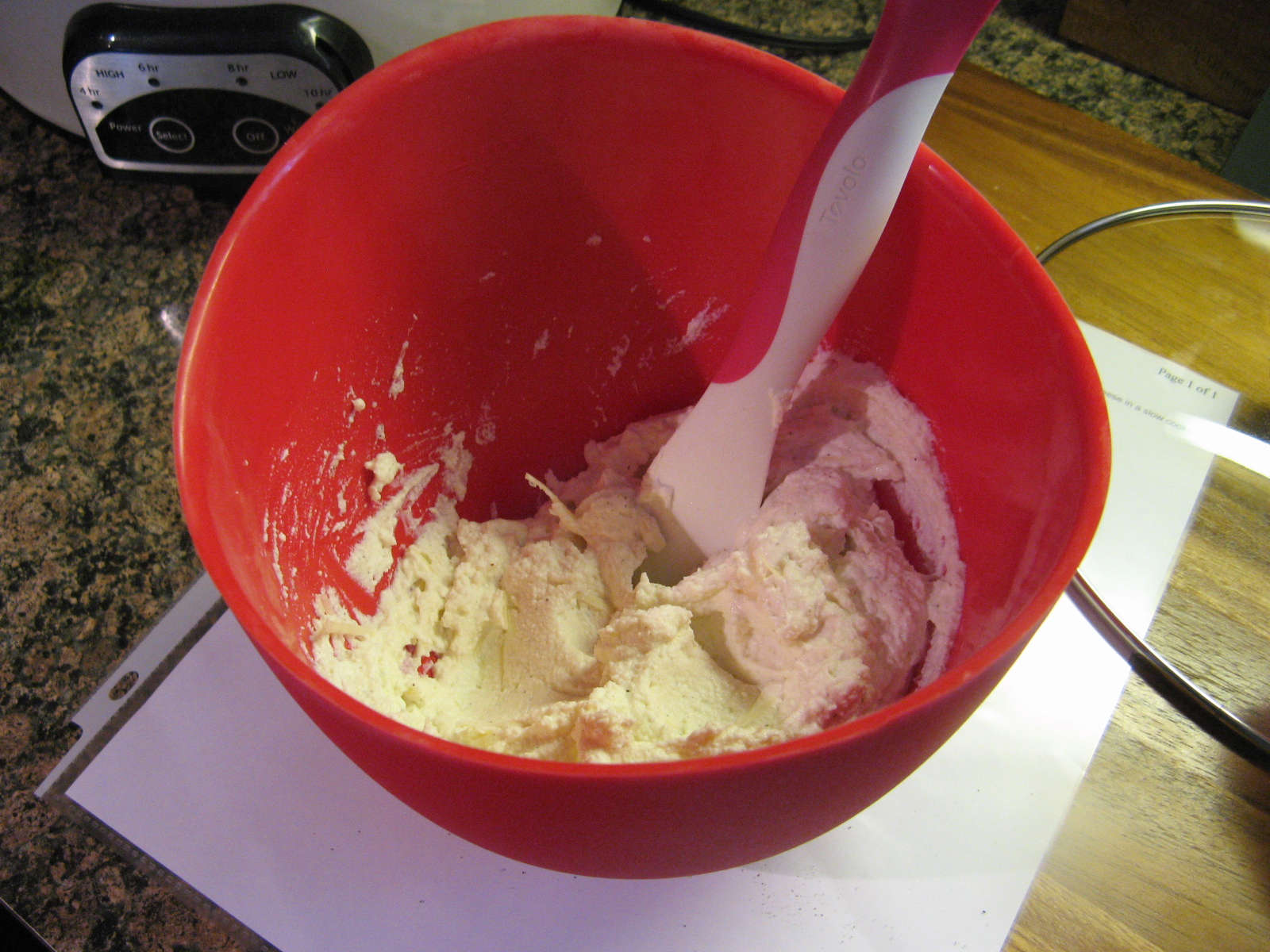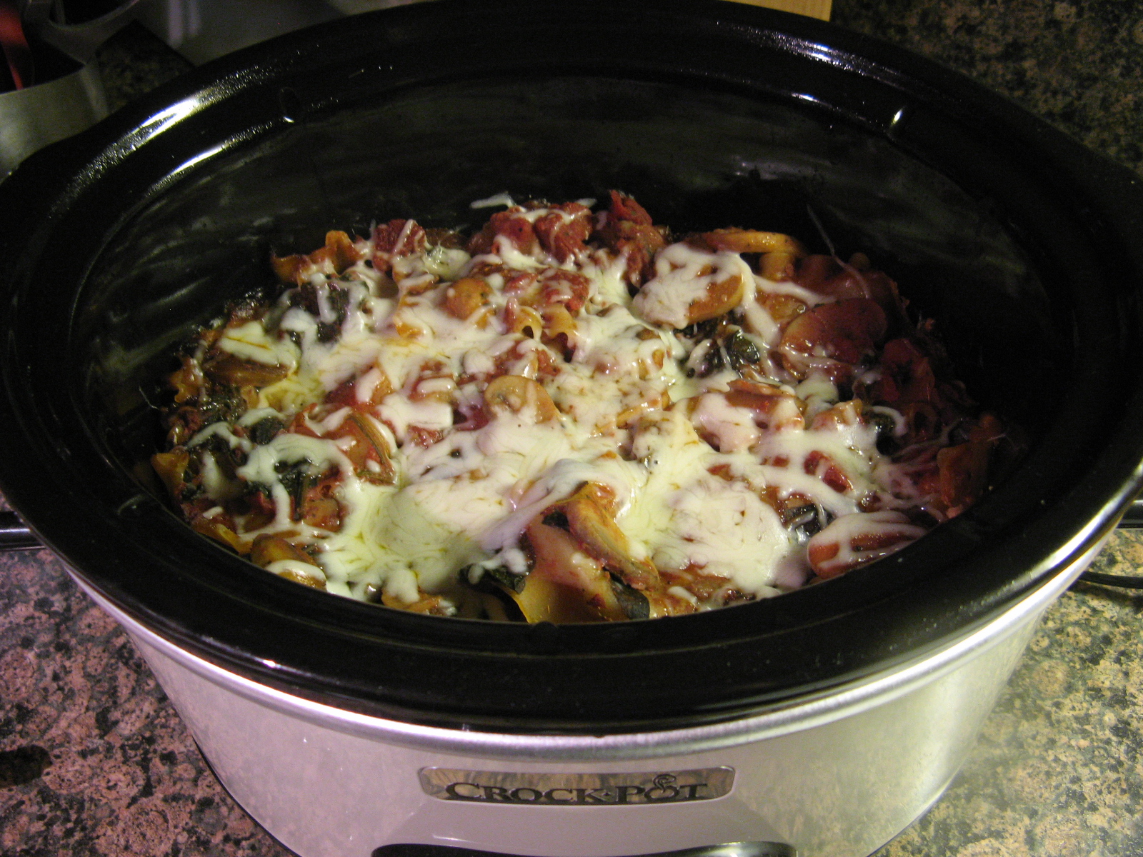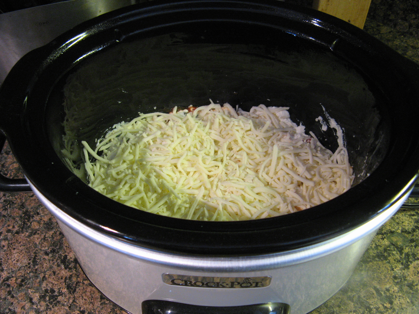 After covering it and cooking it on low for 5 hours I topped it with the remaining mozzarella and parmesan cheeses, covered it once again and let it stand for an additional 5 minutes until the cheeses had melted.