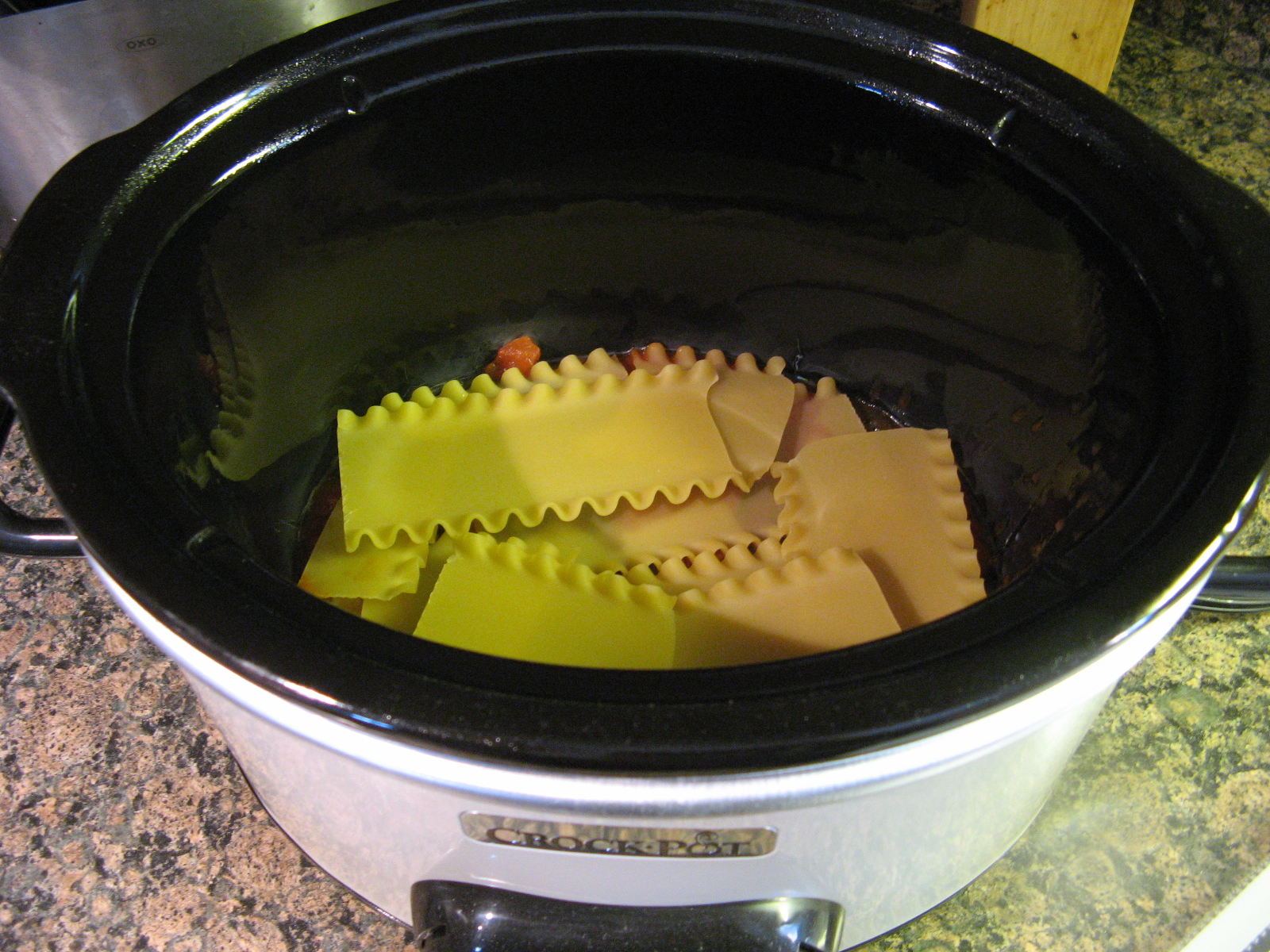 After spraying the inside of my slow cooker with cooking spray I spread 3/4 cup of the sauce into the bottom of it. I then layered 3 lasagna noodles over the sauce…