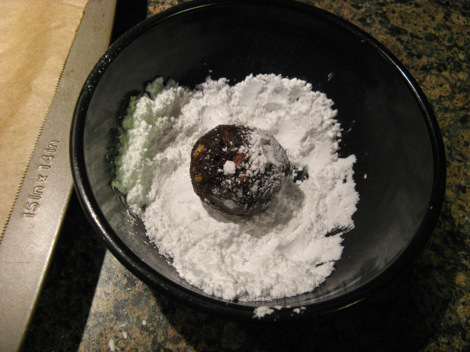 Using a small cookie scoop (or about 2 teaspoons), scoop the dough and roll in confectioners’ sugar and place on a parchment lined cookie sheet.