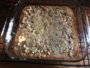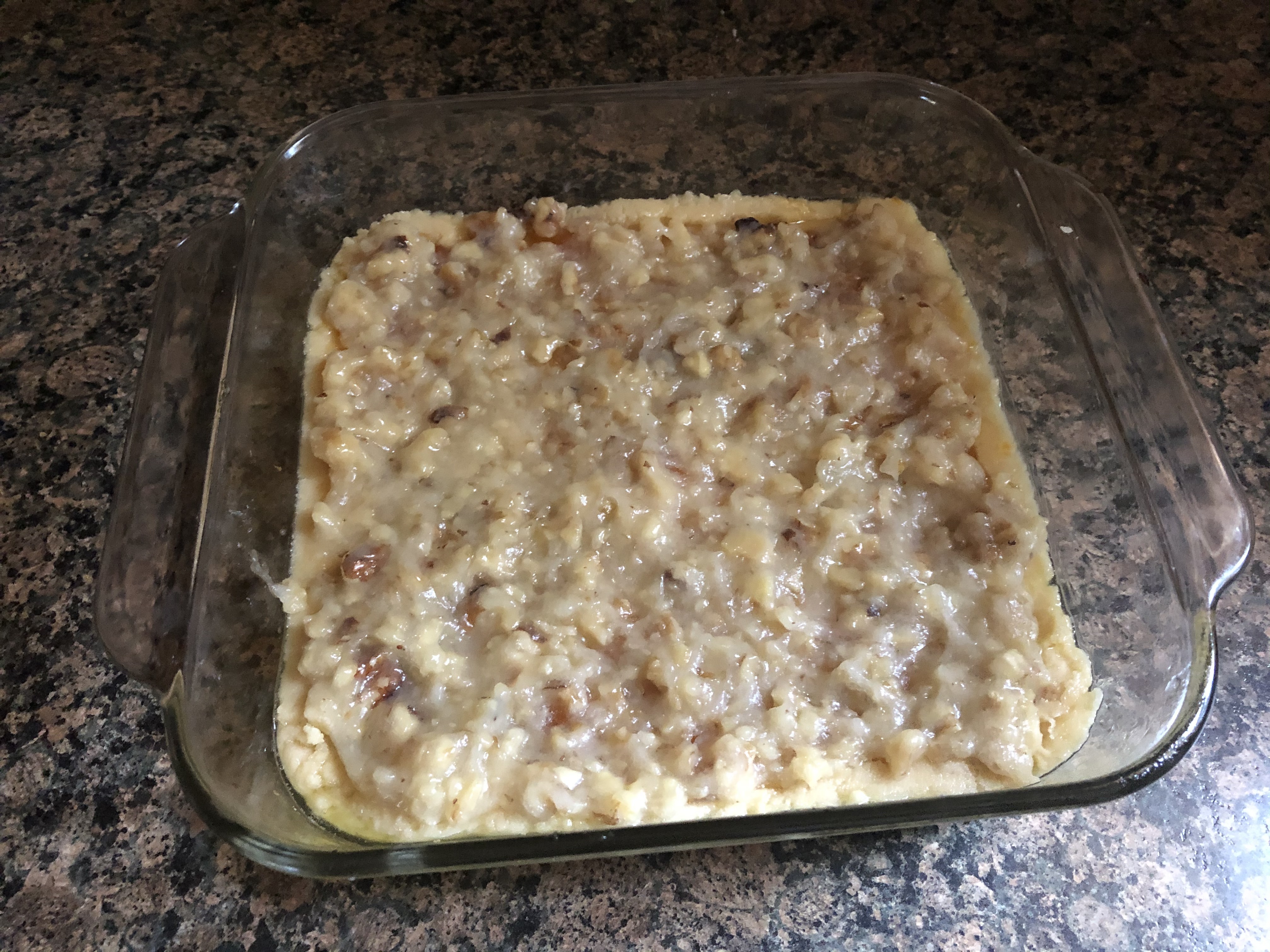 And finally, I combined melted butter, sugar, water and chopped walnuts in a small bowl and then spread it over the apricot preserves.