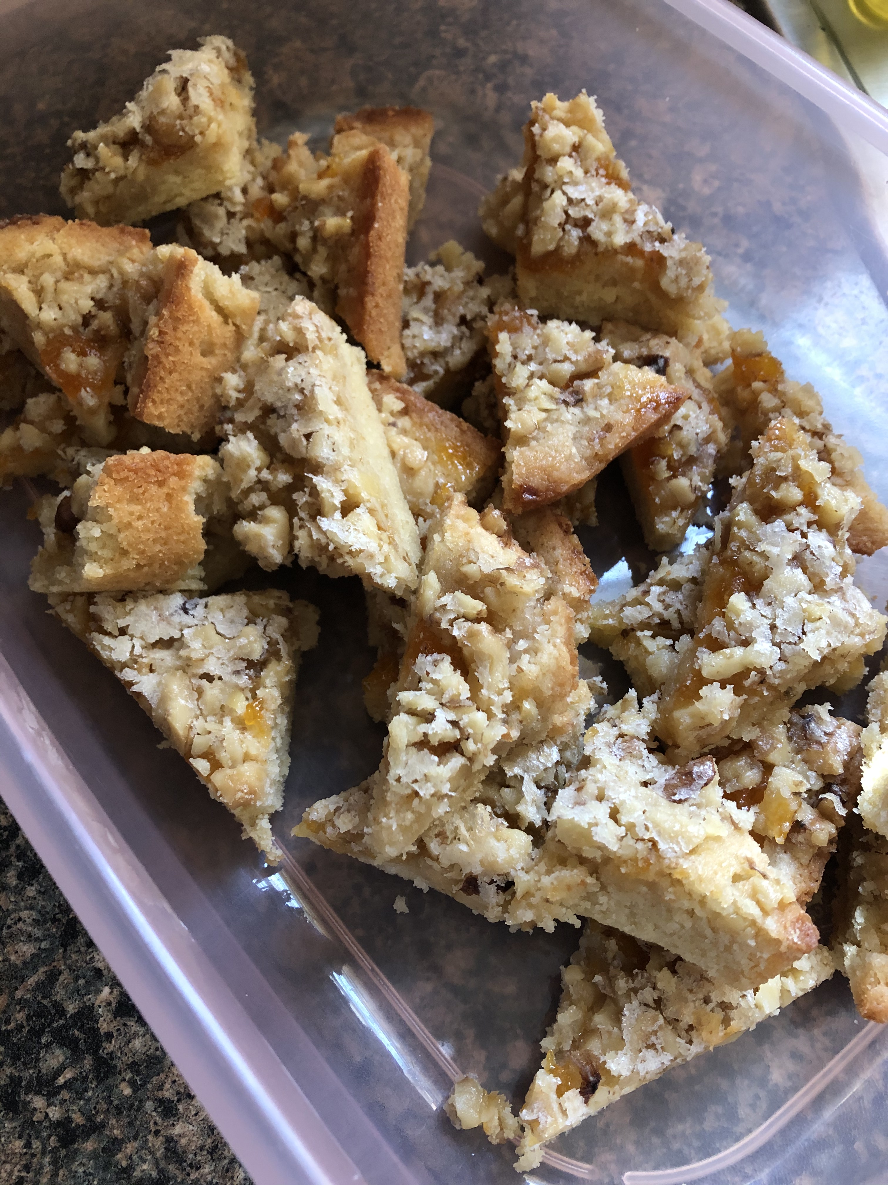 I baked it in a 350 F preheated oven until the edges began to brown and the center was set, about 35 minutes. After letting it cool in the dish for about a half hour on a wire rack, I cut the cookies into 4 equal parts and then removed it from the dish and cut each square into 4 2-inch squares and then cut those squares into triangles. I then placed them back on the wire rack to cool completely.