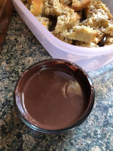 And to finish the cookie bars, once they were completely cooled, I melted a cup of dark chocolate chips in the microwave and dipped the corner of each cookie in the chocolate.