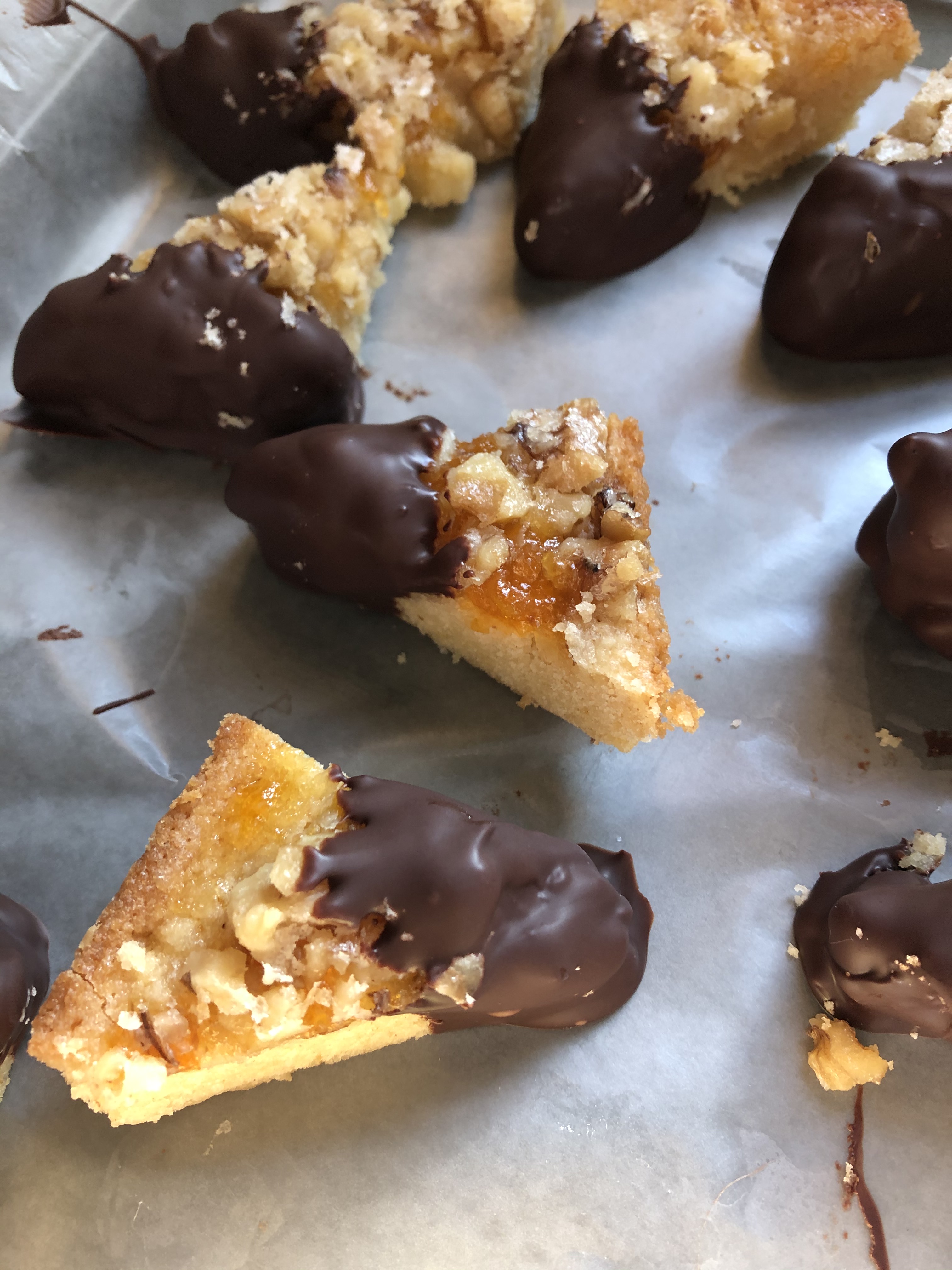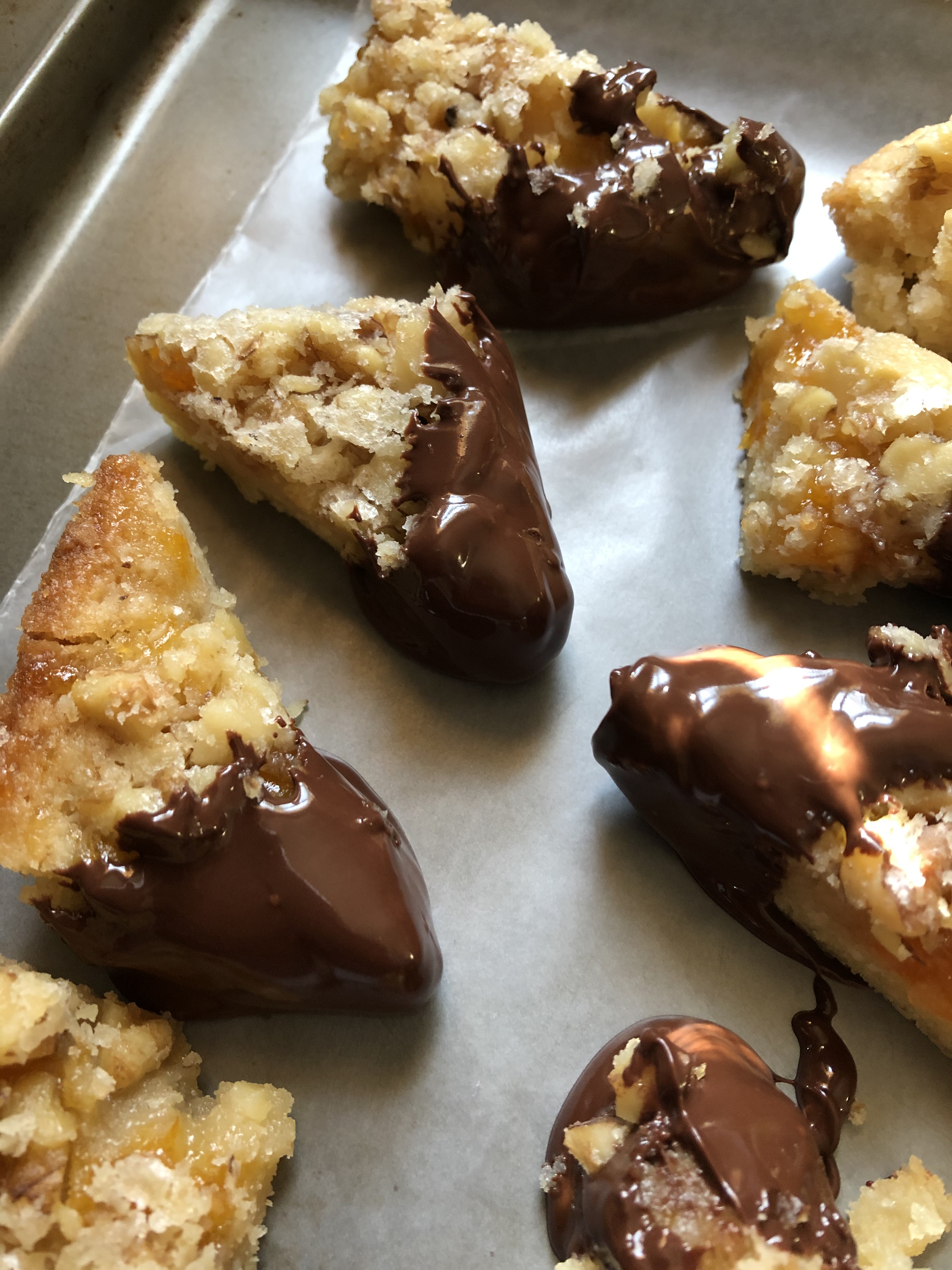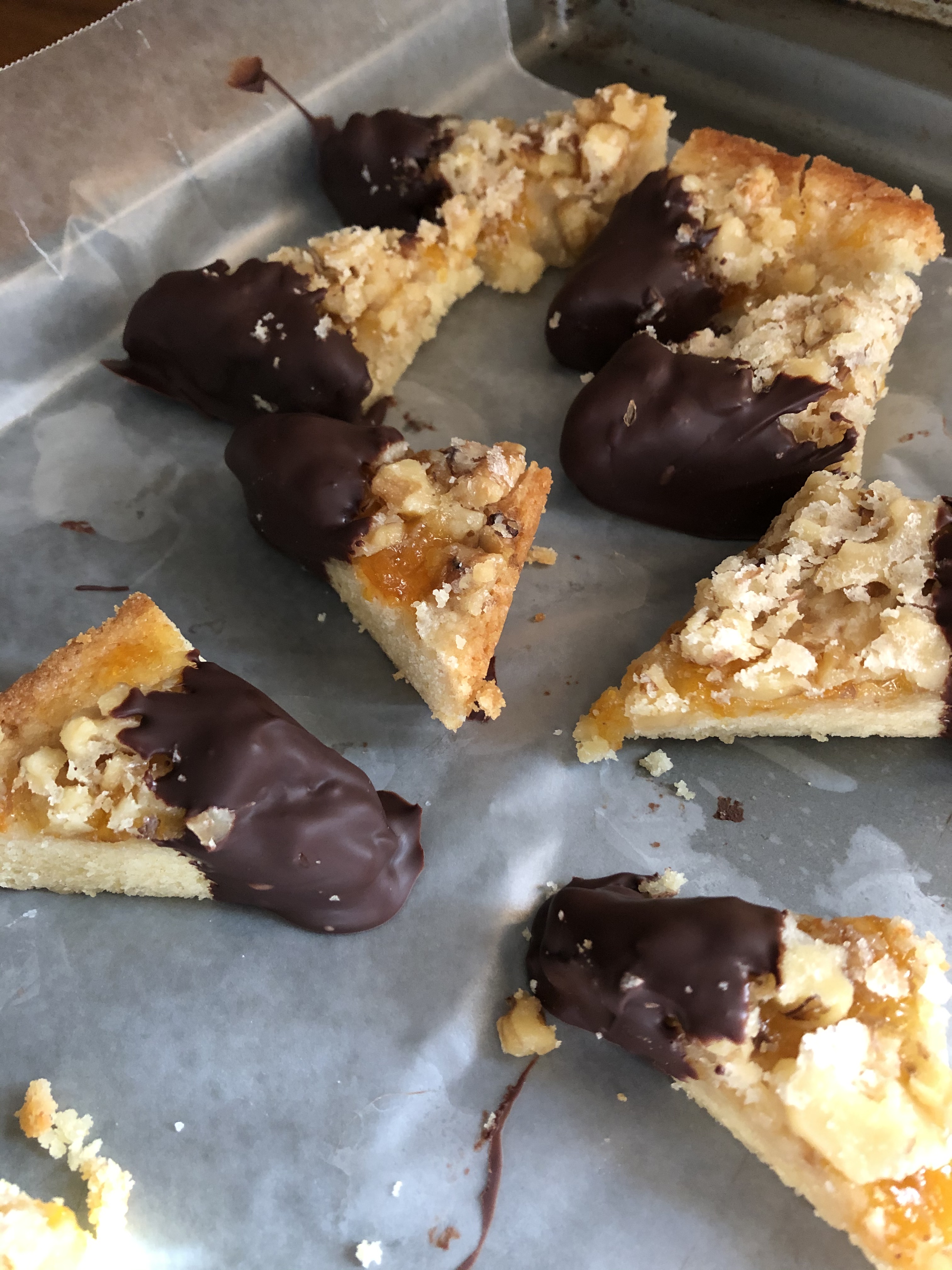 I placed them in the fridge for a few minutes so the chocolate could set and then it was time to enjoy. As I mentioned, the crust is reminiscent of a shortbread cookie and the topping that of the filling for rugelach. With a combination like that you can’t go wrong! What’s also nice about these cookie bars is that the flavors can be switched around just by using a different jams/preserves and/or nut. To make these extra festive for the holidays you could swap out the apricot preserves with raspberry jam and use white chocolate in lieu of the dark chocolate.