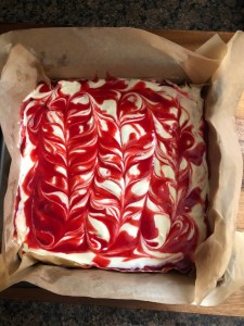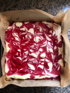 Now it was time to assemble. I poured half of the cream cheese mixture into the center of the pre-baked crust and then using a small offset spatula I spread the mixture evenly over the crust, making sure that I got it into the corners. I drizzled half of the raspberry sauce (about 3 tablespoons) over the cream cheese and then poured the remaining cream cheese mixture over the sauce. Once again using the small off-set spatula to spread the mixture. Finally, I drizzled the remaining sauce over this second layer of cream cheese and then using a knife I gently swirled everything together.
